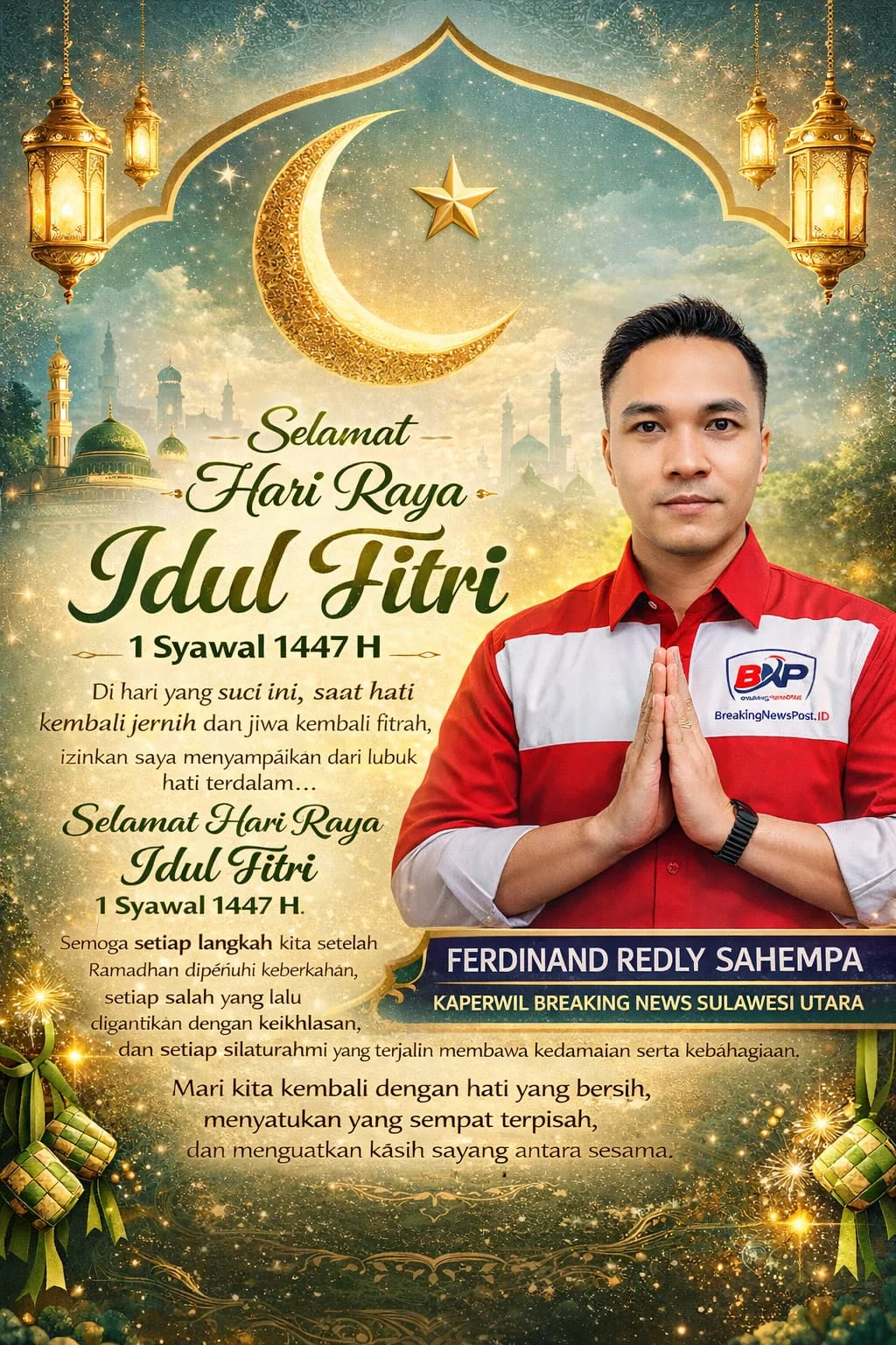 ManadoBreakingNewspost.id Di tengah gemuruh takbir yang bergema dari Masjid Agung Fajar Indah hingga gereja-gereja di Manado, Keluarga Besar Kaperwil BreakingNewspost.id Sulawesi Utara melalui Ferdinand Redly Sahempa menyampaikan ucapan Selamat Hari Raya Idul Fitri 1447 H. Minal aidin wal faizin dan mohon maaf lahir batin menjadi panggilan untuk mempererat persaudaraan di tanah Minahasa yang terkenal harmonis.