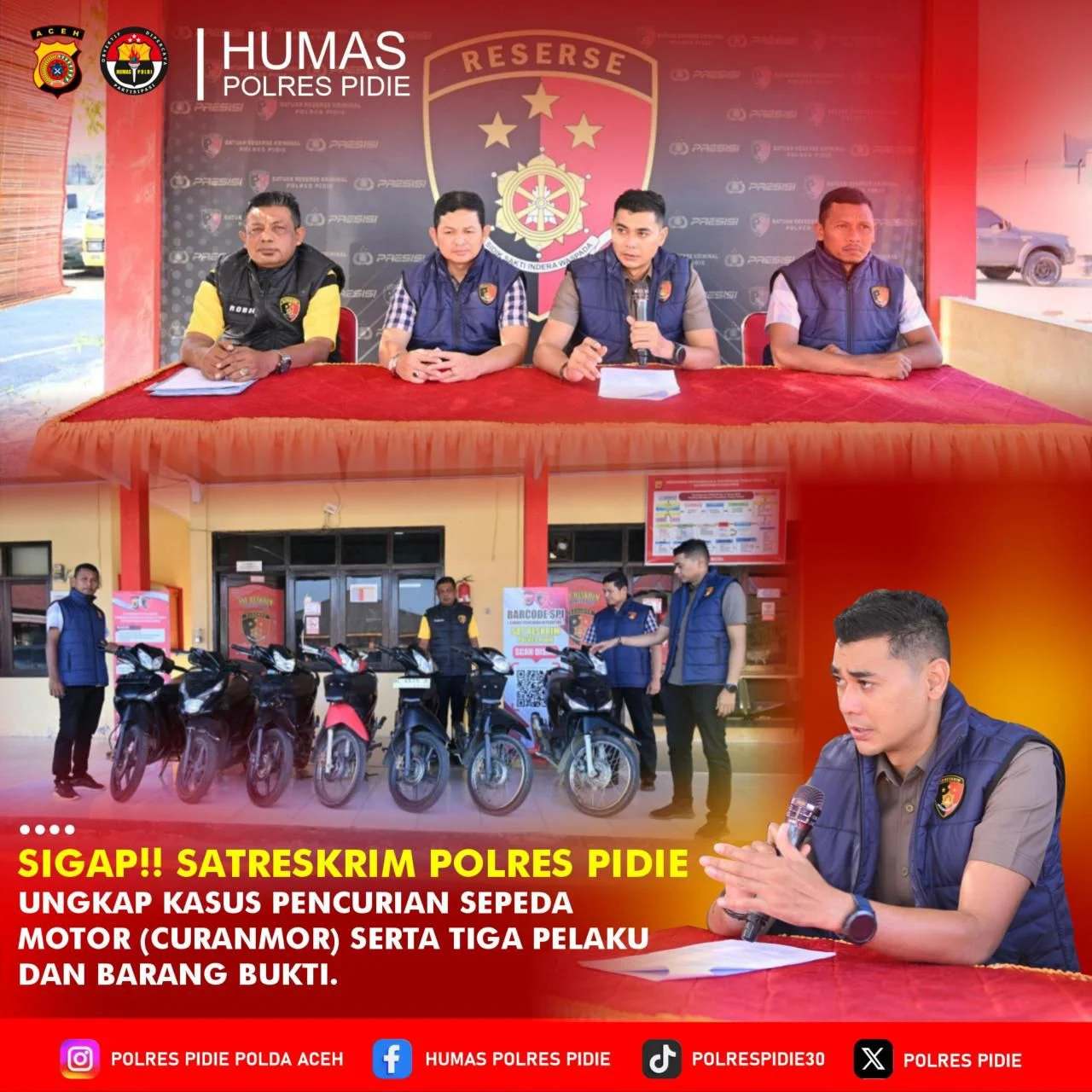 Pidie–BreakingNewspost.id – Satuan Reserse Kriminal (Satreskrim) Polres Pidie berhasil mengungkap kasus pencurian sepeda motor (curanmor) yang terjadi di beberapa lokasi di wilayah Kabupaten Pidie. Kamis, 23/4/2026.